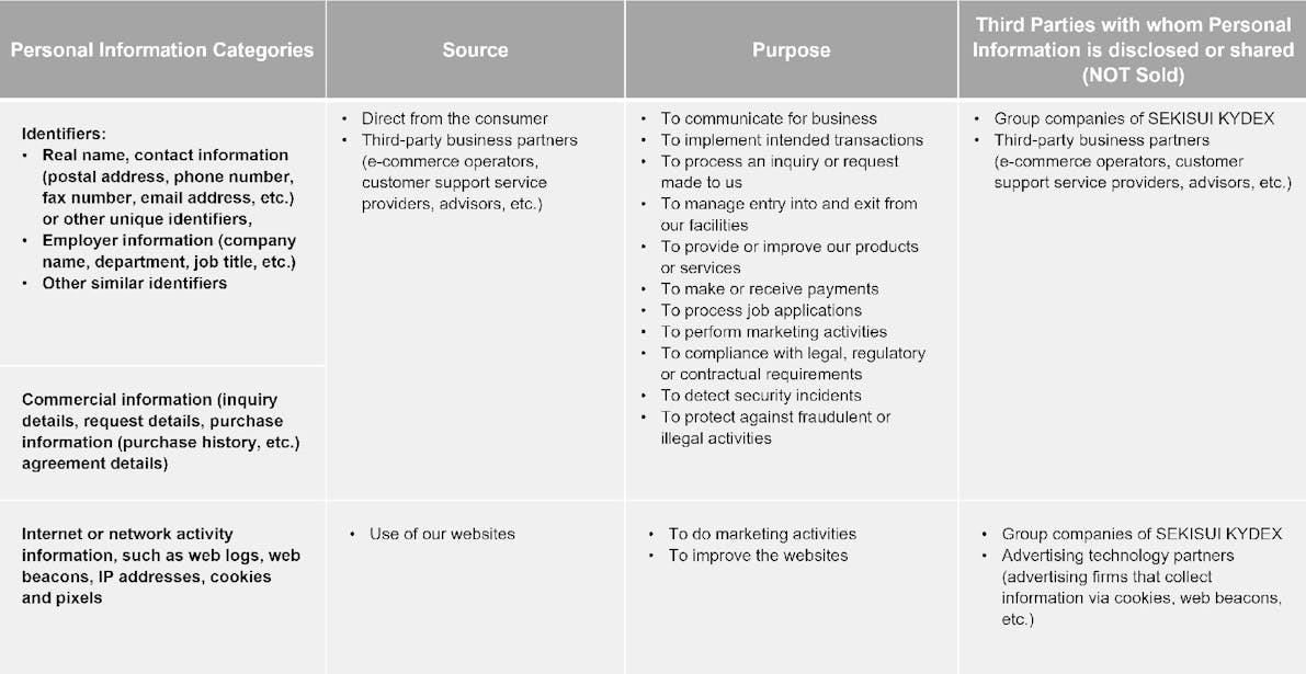 We may collect, use, disclose Personal Information. Personal Information which may have been collected by us in the preceding 12 months and may be disclosed or shared is as listed below.